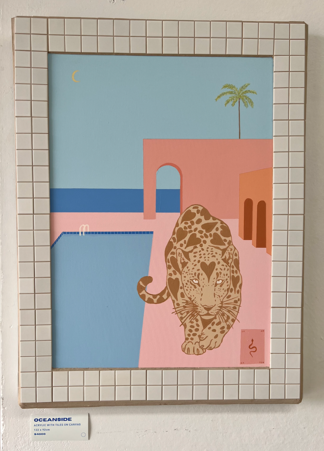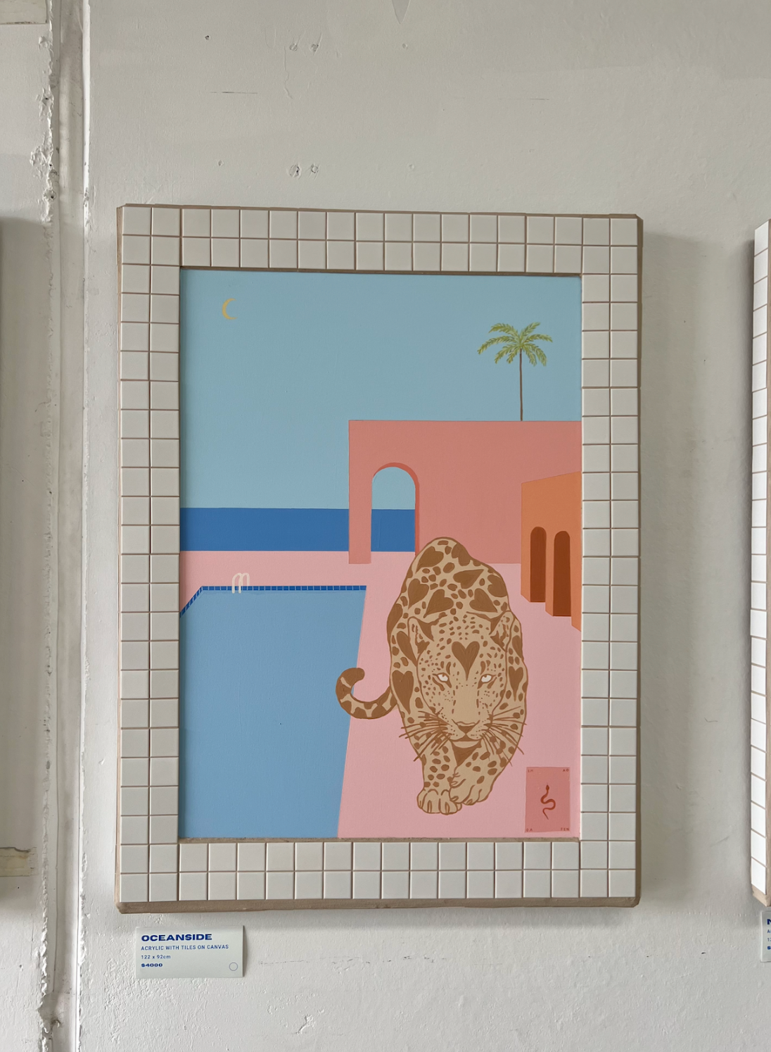 Original Acrylic Painting, on Stretched Canvas with Porcelain White Tile Boarder